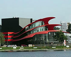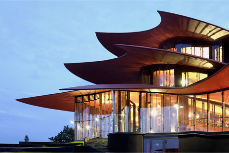 A modern theatre building with shell shaped roofs, foyer and an administration sector